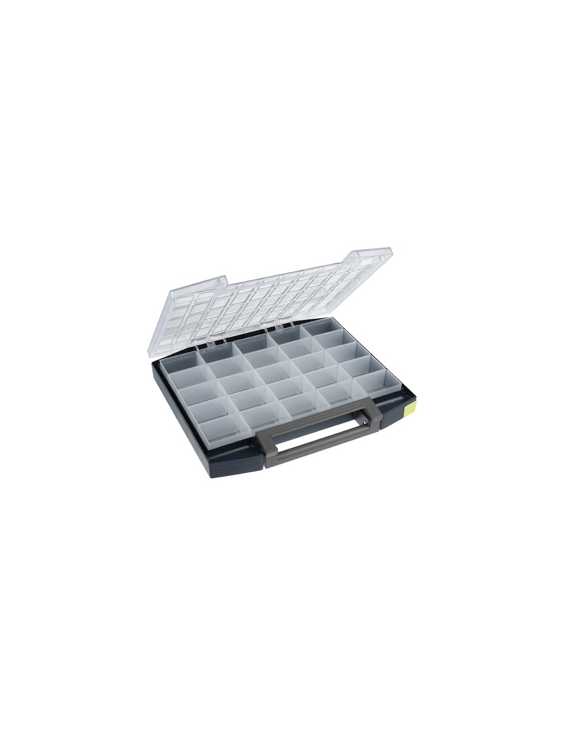Maletín de polipropileno y tapa de policarbonato y con perfiles en O hacen que no se muevan las pequeñas piezas.