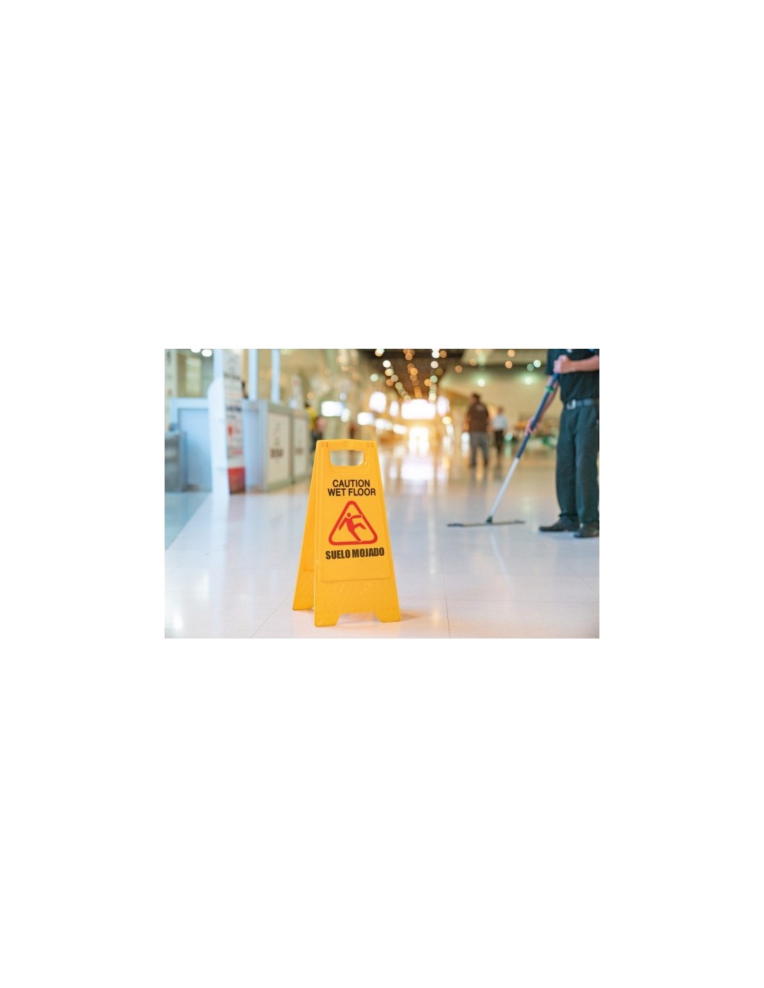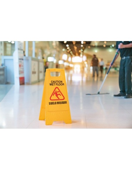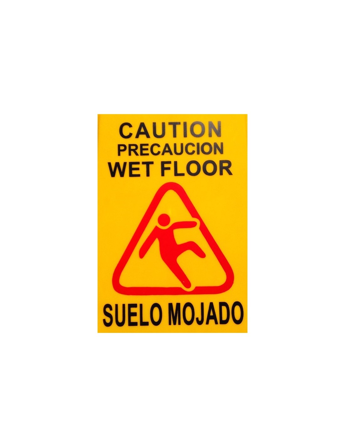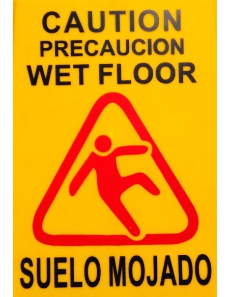 Señal que indica precaución por estar el suelo mojado. En inglés y español por ambos lados.